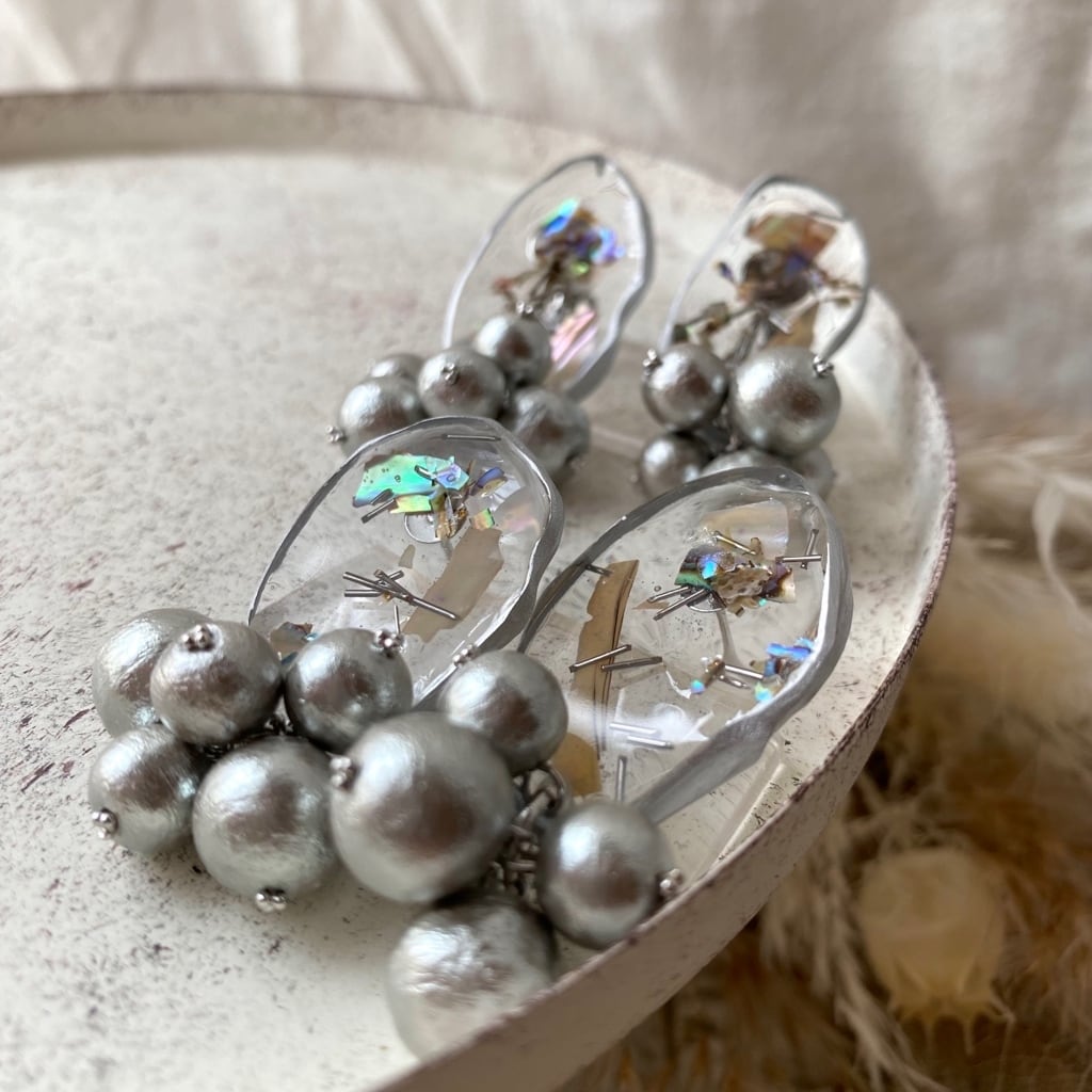 シェル×クリアレジンジオードの鈴なりコットンパール は、輝くクリアレジンに包まれたシェルとコットンパールが美しく輝くアクセサリーです♡